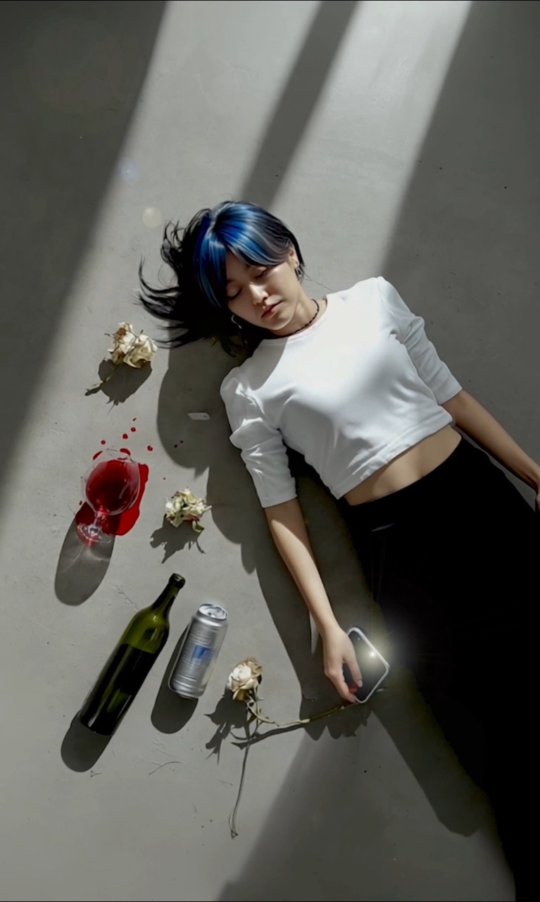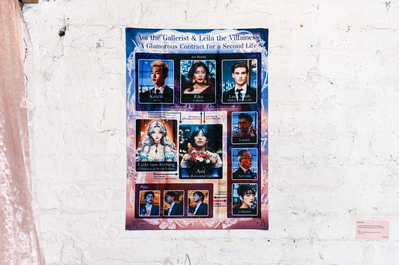 Integrating generative AI to depict Aoi’s future, Endo installed these videos in a gallery space staged as the “death-returned" present. By performing the gallerist's role and engaging in actual sales, she blurred the boundaries between fiction and reality, narrative and institution.